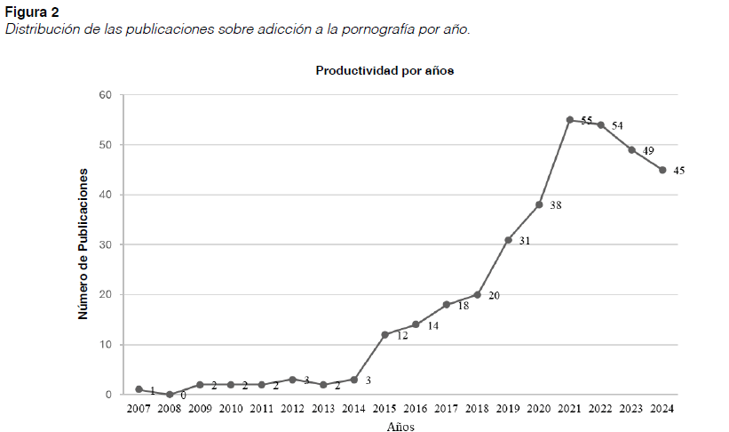 Discussion and conclusions: the findings reflect significant publication growth since 2015, underscoring the increasing interest in pornography addiction as a public health issue. Further research is needed in underrepresented regions like Latin America and Africa.