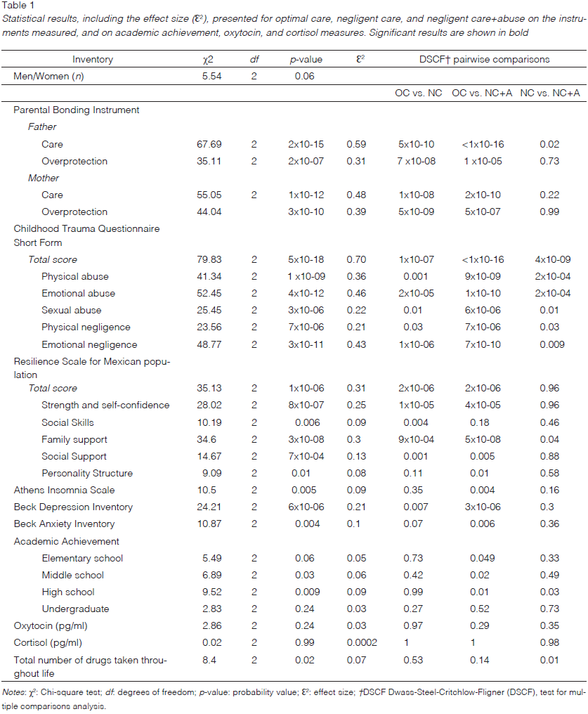 Subjects were classified according to the scores obtained in the parental bonding instrument and CTQ, as follows: perception of parental bonding was classified as optimal vs. low parenting, according to the classification of care and overprotection provided by each parent. When subjects responded that they received optimal parenting from both parents, according to the PBI (i.e., high care and low overprotection) and lacked any type of child abuse, they were grouped into the Optimal Care (OC) group. In contrast, when participants reported they did not receive optimal parenting from any of their parents (i.e., neglectful parenting or affectionless control or affectionate constraint) but were not abused, subjects were grouped into the Negligent Care (NC) group. Finally, when participants reported they did not receive optimal parenting from either one of their parents and reported any type of child abuse, subjects were grouped in the Negligent Care + child Abuse (NC+A) group.