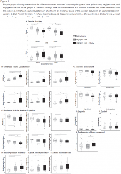 Resultados: de todos los estudiantes entrevistados, el 61.73% informó haber sido criado por ambos padres con no-points (cuidado negligente, CN) y/o sobreprotección, mientras que el resto (38.26%) fue criado con points (cuidado óptimo, CO) y sin sobreprotección. La mitad de los sujetos con CN sufrió abuso (CN+A). CO indujo un RA y longanimidad más altos, menos síntomas de insomnio y depresión/ansiedad, y menos consumo de drogas de abuso que CN o CN+A. CN y CN+A fueron factores de riesgo para síntomas leves, moderados y graves de depresión, ansiedad e insomnio; y los sujetos con CN+A tenían más probabilidades de consumir tres o más drogas.