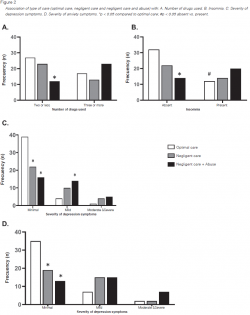 Results: of all the students interviewed, 61.73% reported being raised from both parents with no-points (negligent care, NC) and/or overprotection, while the rest (38.26%) were raised with points (optimal care, OC) and no overprotection. Half of the NC subjects suffered abuse (NC+A). OC induced higher AA and resilience, less insomnia and depression/anxiety symptoms, and fewer number of drugs of abuse than NC or NC+A. NC and NC+A were risk factors for mild, moderate, and severe symptoms of depression, anxiety, and insomnia; and NC+A were more likely to consume three or more drugs.