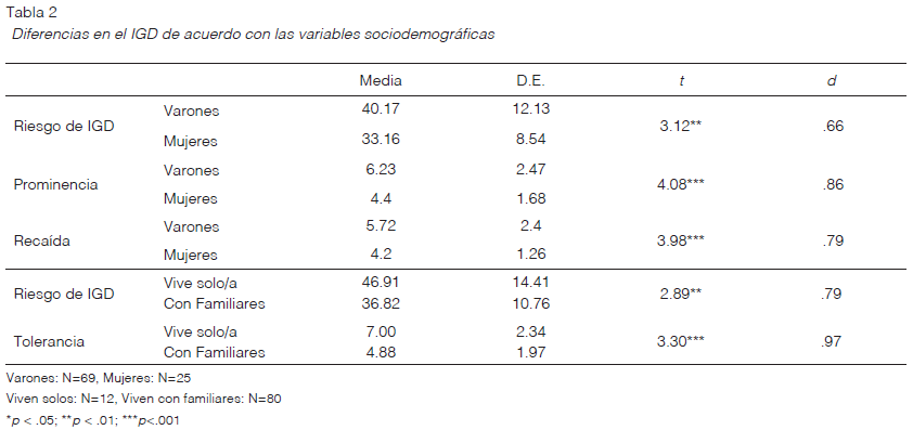 Con el fin de explorar si existen otras variables vinculadas al riesgo de desarrollar IGD, se analizó su relación con las variables sociodemográficas, en cuyo caso sólo se encontraron diferencias en función al sexo de los participantes y a la condición de vivir solos. En el primer caso, los varones presentaron un mayor nivel de riesgo, especialmente en las áreas de Prominencia y Recaída. Asimismo, quienes viven solos presentan un mayor riesgo de desarrollar IGD, en particular en la dimensión de Tolerancia (Tabla 2). No se hallaron relaciones con otras variables reportadas en la ficha de datos como el género de videojuegos, autopercepción de rendimiento, si tiene pareja, si juega solo o con amigos, percepción de salud y si ha tenido tratamiento psicológico.