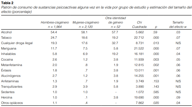 En general, el grupo de mujeres-cisgénero reportó bajos porcentajes de consumo de sustancias psicoactivas en comparación con los otros dos grupos. Específicamente en el grupo de hombres-cisgénero, las sustancias con un consumo significativamente mayor alguna vez en la vida fueron mariguana, metanfetamina y otros opiáceos. Por su parte, el grupo correspondiente a otra identidad de género reportó un consumo significativamente mayor en inhalables, cocaína, éxtasis, alucinógenos y heroína; también registró un consumo ligeramente mayor en anfetaminas y tranquilizantes.