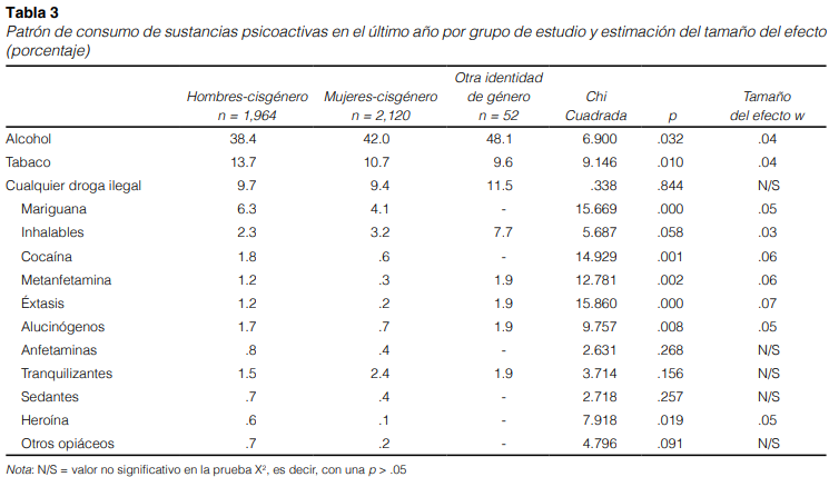 Finalmente, es importante resaltar que, si bien en algunos casos el valor de las pruebas estadísticas mostró diferencias ampliamente significativas (p < .01), al comparar las características de consumo de sustancias alguna vez, en el último año y el último mes entre los hombres-cisgénero, las mujeres-cisgénero y quienes se identifican con otra identidad de género, en prácticamente todos los casos el tamaño del efecto fue de moderado a bajo; esto sugiere tomar con cierta cautela las diferencias obtenidas, pues si bien resultan ser significativas, probablemente hay un efecto de sesgo por los tamaños muestrales de cómo es que se conformó cada uno de los grupos de estudio, en especial el de otra identidad de género. El uso de sustancias psicoactivas está apareciendo con mayor frecuencia a edades cada vez más tempranas, en la etapa más temprana de la adolescencia donde incluso la identidad de las personas (incluyendo la identidad de género) está en un proceso de definición y consolidación, lo que puede ser un nicho de interés para futuras investigaciones en el marco de la exploración y estudio del uso de sustancias en esta etapa de reconstrucción del sujeto.