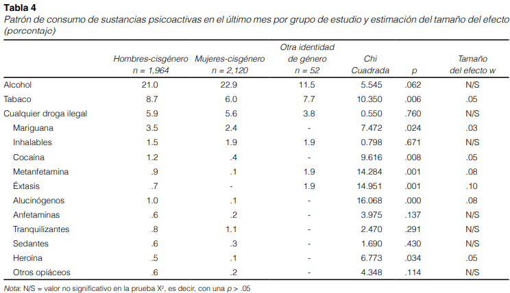 Al realizar un análisis más específico por sustancia, se encontró que el grupo de hombres-cisgénero reportó un consumo significativamente más alto en mariguana, cocaína, alucinógenos y heroína; aunque también reportó un consumo ligeramente más alto de anfetaminas, tranquilizantes y otros opiáceos. Durante este mismo periodo (últimos 30 días) el grupo de mujeres-cisgénero registró un consumo ligeramente mayor de inhalables y alucinógenos. Por su parte, los estudiantes que se asumieron con otra identidad de género reportaron un consumo significativamente más alto de metanfetaminas y éxtasis. Finalmente, el uso de inhalables fue similar al reportado por el grupo de mujeres-cisgénero.