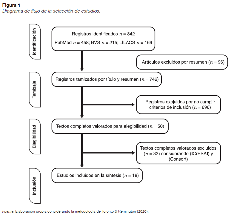 Method: the methodology proposed by Toronto & Remington (2020) was used; the process of evaluation and selection of articles with a quantitative approach, the eligibility criteria instrument for the selection of research articles (ICrESAI) was used and the evaluation of randomized clinical trials using a checklist with consolidated standards for trial reporting (Consort).