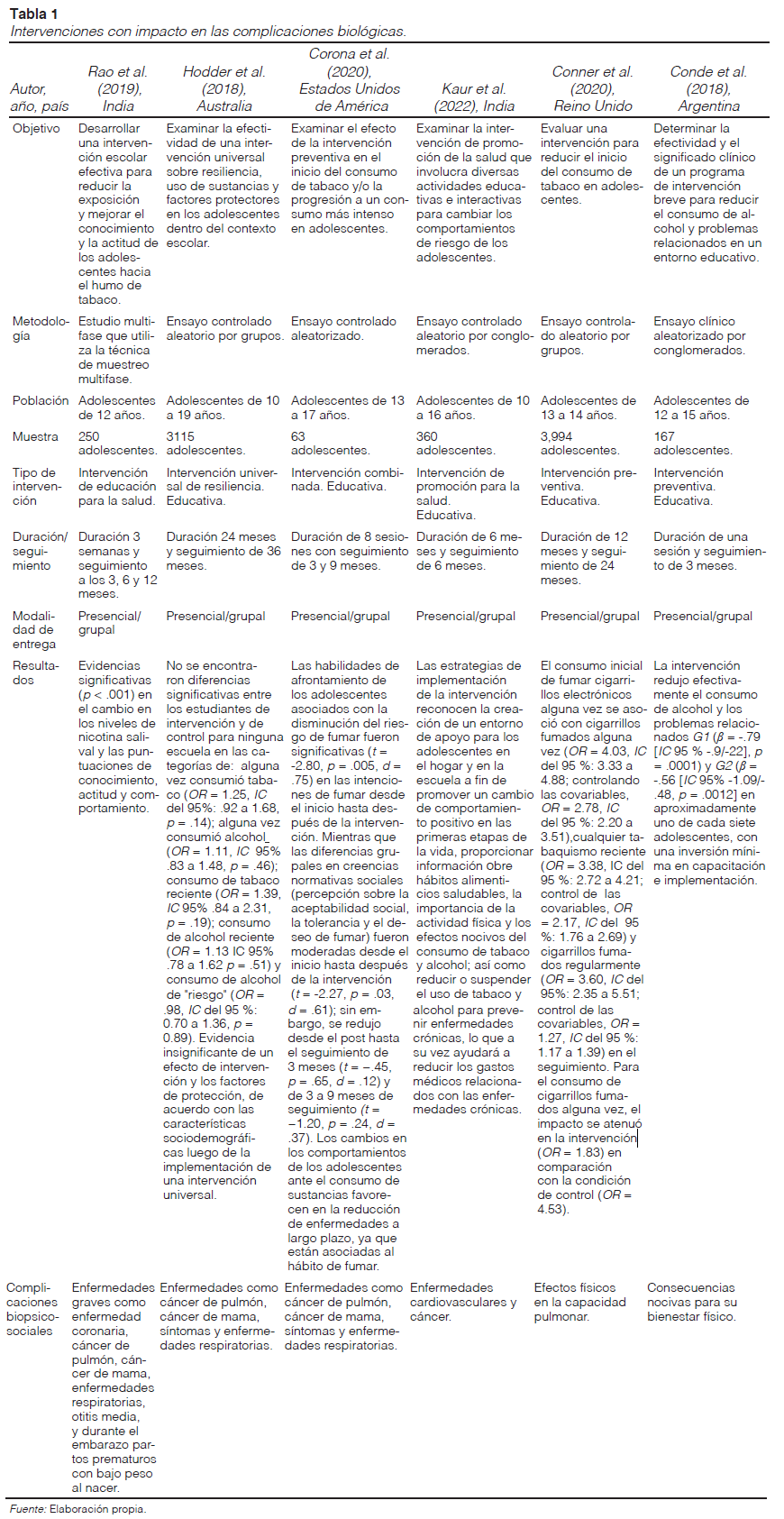 En las siguientes Tablas 1, 2 y 3 se puede observar las características de cada uno de los estudios incluidos en la síntesis de revisión, clasificados por autor, año, país, metodología, población, intervención, duración, modalidad de entrega y resultados de las complicaciones biopsicosociales en los adolescentes.