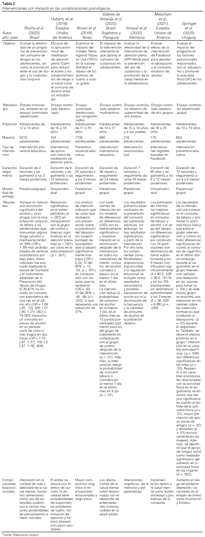 Ahora bien, los estudios de Brown et al. (2019), Meacham et al. (2021), Springer et al. (2020) y Valente de Almeida et al. (2022), indican que las afectaciones a la salud mental presentes en esta etapa de adolescencia por consumo de sustancias adictivas comprometen las funciones cognitivas, incrementan el riesgo de padecer depresión y que la adaptación de conductas de riesgo persista en el siguiente ciclo de vida. En este sentido, las intervenciones con enfoque preventivo en etapas tempranas posibilitan que los adolescentes reduzcan los efectos negativos que impactan su salud mental.