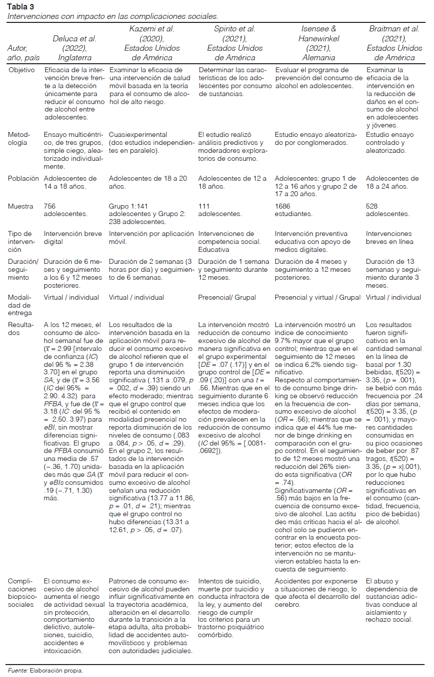 Al analizar la evidencia actual de los estudios presentados en esta revisión integrativa, se puede identificar cuáles son las complicaciones biopsicosociales del consumo de sustancias; asimismo, permite conocer cuáles intervenciones y qué componentes son más eficaces para abordar las afectaciones de tipos fisiológicas, psicológicas y sociales asociadas al consumo de sustancias adictivas en los adolescentes.