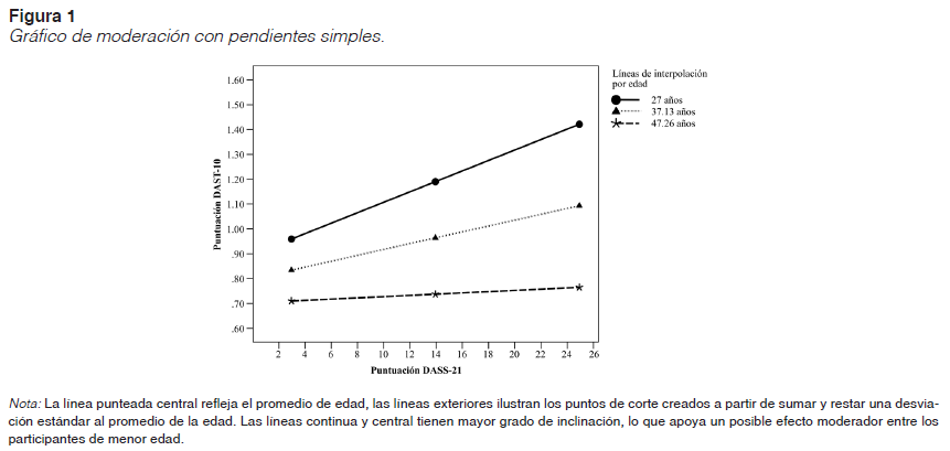 Por su parte, la edad mostró un efecto moderador negativo de baja intensidad (B = -.001, p < .05) sobre la relación entre el distrés psicológico y el riesgo de problemas por uso de sustancias ilícitas. Esto se puede apreciar en la Figura 1, donde el gráfico de pendientes simples muestra que la relación entre el distrés y el riesgo de problemas por uso de sustancias es de mayor intensidad entre las personas de menor edad.