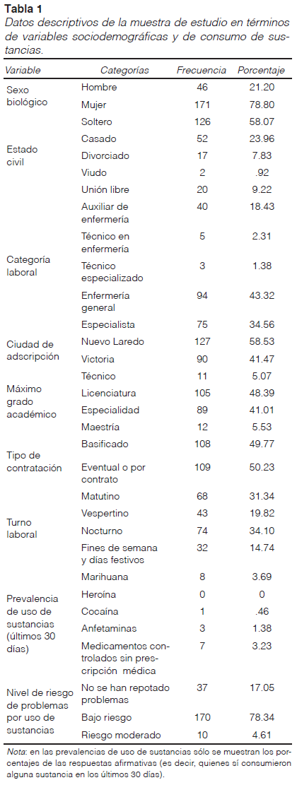Se aplicó una cédula de datos sociodemográficos y tres escalas. La ficha sociodemográfica y de perfil de consumo de sustancias fue diseñada ex profeso para el estudio a través de 20 preguntas, donde se recabó información de sexo, edad, estado civil, categoría y antigüedad laboral, turno de trabajo, tipo de contratación y uso de sustancias psicoactivas ilícitas.