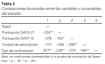 En la Tabla 2 se muestra que la puntuación DASS-21 y la puntuación DAST-10 se correlacionaron positiva y significativamente. Asimismo, la edad se relacionó negativamente con el distrés psicológico aunque con un coeficiente moderado, lo cual indica menor probabilidad de colinealidad y resalta su importancia en el modelo. Entre las variables contextuales, el tipo de contratación presentó asociación con el indicador del distrés y la edad, mientras que la ciudad de adscripción se vinculó con la puntuación del instrumento DAST-10, lo cual justificó su inclusión como covariables para reducir los sesgos en la estimación de los efectos principales (Tabla 2).