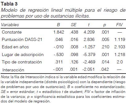 Resultados: se encontró una correlación positiva entre distrés psicológico y riesgo de consumo de sustancias ilícitas (rs = .152, p < .05). El modelo fue significativo (F = 10.164, p < .001, R2 = 19.4%) y el distrés fue predictor del riesgo de consumo de sustancias ilícitas (B = .046, p < .01), incluso al incorporar covariables. La edad moderó esta relación, donde hubo un efecto más fuerte en participantes menores de 40 años.