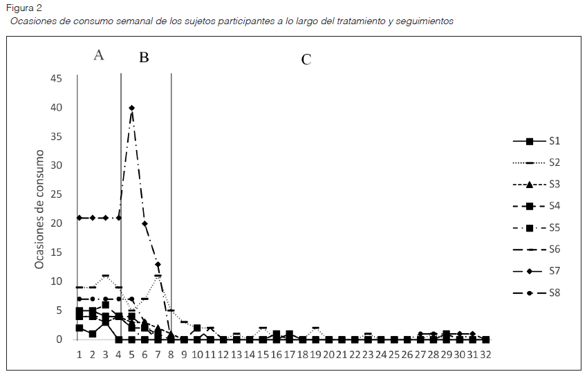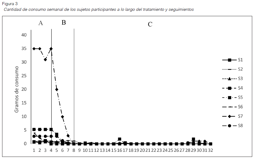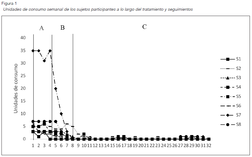 Respecto a las unidades (Figura 1), ocasiones (Figura 2) y cantidad de consumo (Figura 3), se puede observar una línea base estable (A), excepto por el sujeto 7. En la fase de tratamiento (B) se observa una disminución de cada una de las variables para todos los sujetos. Sin embargo, al concluir el tratamiento mediante la prueba de orina DrugCheck® Dip Drug se encontró que cuatro de ellos (2, 4, 7 y 8) reportaron resultados positivos. En la fase de seguimientos (C) en comparación con (B), se observa una disminución de las tres variables en todos los sujetos. No obstante, tres de ellos (4, 7 y 8) aún presentaron consumo en el último seguimiento corroborado con la prueba de orina.