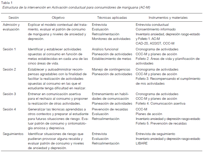 Introducción: en México el consumo de mariguana ha aumentado en estudiantes universitarios, lo cual ocasiona problemas en atención, concentración, ansiedad, depresión, dependencia y problemas cardiorrespiratorios. Las intervenciones psicológicas como la intervención breve motivacional (IBM) y la terapia cognitivo conductual (TCC) han reportado algunas dificultades, como un tamaño del efecto entre bajo y medio, disminución de consumo sin llegar a abstinencia y la heterogeneidad en el uso de técnicas tanto cognitivas como conductuales. El uso de técnicas conductuales, principalmente en activación conductual, ha reportado efectividad en el tratamiento de ansiedad, depresión y más recientemente de alcohol y tabaco.
