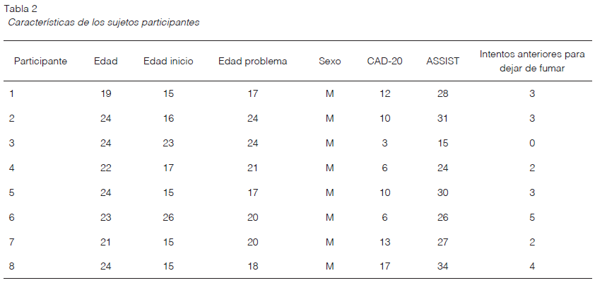 En las características de la muestra se encontró una edad promedio de 22.6 años de edad; edad de inicio de consumo X = 17.7; edad problema X = 20.12; intentos de dejar el consumo X = 2.75. Respecto al nivel de problemas asociados al consumo de mariguana de acuerdo con el CAD-20 un participante reportó nivel bajo, cuatro reportaron nivel moderado, dos con nivel sustancial y uno con nivel severo. De acuerdo con el ASSIST sobre el nivel de intervención, tres participantes reportaron intervención breve y cinco requirieron intervención intensiva (ver Tabla 2).