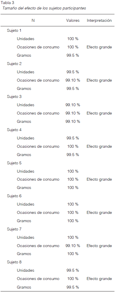 Con respecto al tamaño del efecto (ver Tabla 3) se muestra un efecto grande para cada una de las tres variables en los ocho sujetos.