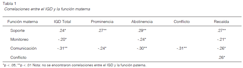 Resultados: se encontraron asociaciones significativas entre ambos constructos en relación con la función materna, más no con la función paterna. Aquí aparece una correlación positiva entre el IGD y la percepción de soporte de la madre (r=.24, p<.05) y negativa con la comunicación (r=-.31, p<.01) y el monitoreo (r=-.20, p<.05)).