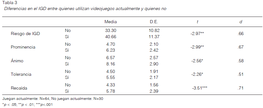 Con relación a las variables asociadas a los hábitos de juego, se hallaron varias diferencias. Quienes reportaron que jugaban videojuegos actualmente presentaron mayor riesgo de IGD; específicamente mostraron mayor Prominencia, Ánimo, Tolerancia y Recaída que quienes no reportaron jugar actualmente (Tabla 3).