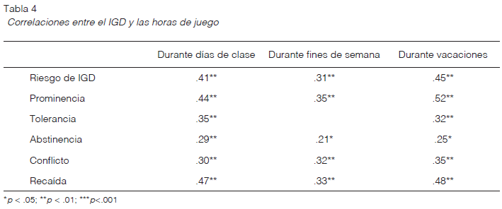 Finalmente, el tiempo dedicado al juego también muestra asociaciones con el riesgo a desarrollar el trastorno. Se encontró que, a mayor número de horas de juego, particularmente durante días de clase, existe mayor riesgo de IGD y sus dimensiones (Tabla 4).