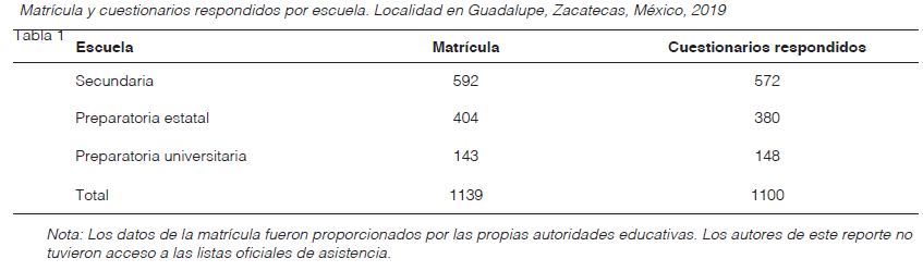 La técnica para la recolección de datos fue la aplicación de un censo. La población estadística estuvo constituida por los estudiantes de secundaria y bachillerato de la localidad seleccionada que se distribuyen en una escuela secundaria técnica, una preparatoria universitaria y una preparatoria estatal, todas públicas. El criterio para delimitar el conjunto de los sujetos de estudio fue que estuvieran inscritos en alguno de esos centros escolares, de modo que se recurrió a los registros administrativos de las instituciones para determinar a la población objetivo.