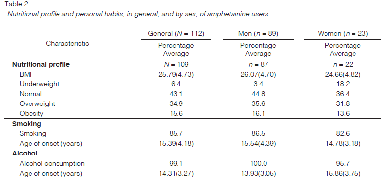 In relation to the nutritional profile, it can be pointed out that in Mexico, the prevalence of overweight and obesity is reported in 39.1 and 36.1% of the population. (SS, INSP & INEGI, 2018). The prevalence of overweight in the general population was very similar to that of amphetamine users, while the prevalence of obesity was higher in the general population. It has been pointed out that amphetamines are anorexigen drugs associated with a decrease in BMI (Zhang et al., 2017), condition that can probably explain the differences in obesity and the prevalence of underweight people (especially women) in this work.