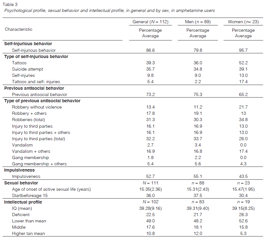 On the other hand, the profile of amphetamine users has some peculiarities. Psychotic manifestations were very frequent in the population, especially in women, with auditory hallucinations, delirium, depression and paranoia, which facilitate aggressive behaviors against themselves and towards third parties. Suicide attempts were frequent, with an overall frequency of 35.7%. The antecedent of previous antisocial behavior was also high.