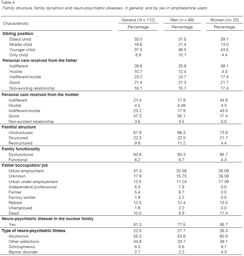 In conclusion, the profile of amphetamine users described in this work coincide in many points with the general profile of drug users, that is, they are subjects who come from frequently unstructured and dysfunctional families, where parents do not live harmoniously with their children —or are indifferent to them—, and there also is a history of alcoholism and use of other drugs, especially in the case of the father.