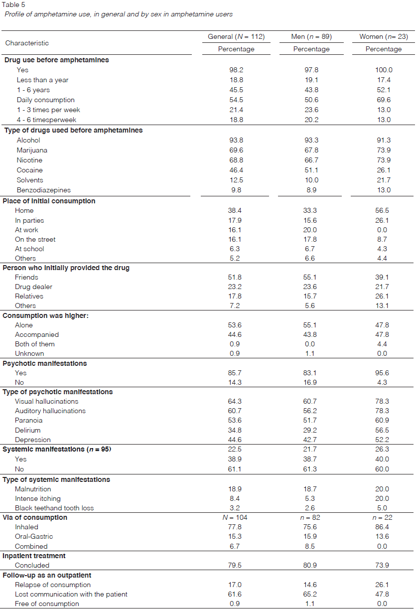 The prevalence of drug use before the use of amphetamines was 98.2%, especially alcohol 93.8% and marijuana (97.8%). Home was the most frequent place of initial consumption (38.4%), and friends (51.8%) provided the drug, more frequently, at the begining. Table 5 presents the rest of the information.