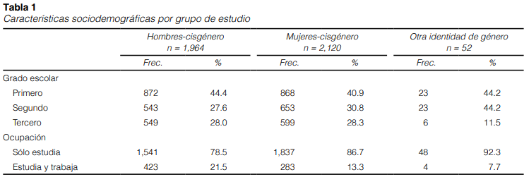 En cuanto a las características sociodemográficas de los participantes, como se muestra en la tabla 1, destaca que la mayoría se encontraba en el primer año de bachillerato; sin embargo, también hubo una participación más alta de estudiantes de segundo año que se asumieron con otra identidad de género. Por otra parte, se identificó que el grupo de hombres-cisgénero tenía una edad mayor, seguido del grupo de mujeres-cisgénero, y una edad menor en el grupo de otra identidad de género (MHombres-cisgénero = 16.3, DEHombres-cisgénero = 1.11; MMujeres-cisgénero = 16.2, DEMujeres-cisgénero = 1.05; MOtra identidad de género = 16.1, DEOtra identidad de género = 1.06).